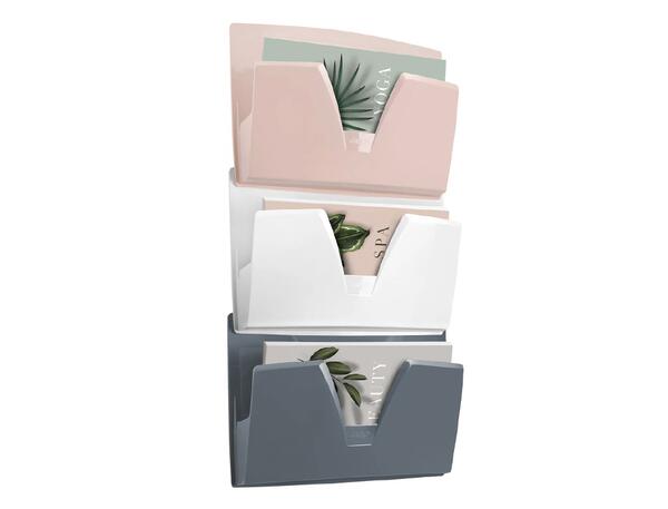 En polystyrène. Corbeilles qui se clipsent les unes sur les autres. Plastique résistant, 33% recyclé, 100% recyclable.' Parois pleines. Ouverture de préhension en V. Système de fixation fourni. Pour documents jusqu'au format A4+.' Echancrures sur les côtés pour insérer des formats très larges (A3+), tubes à dessin, etc. Supporte une charge de 2,5 kg par corbeille ou 5,5 kg uniformément répartis dans les 3. Dimensions d'une corbeille : L 36,1 x H 27 x P 8,6 cm. Lot de 3 corbeilles.