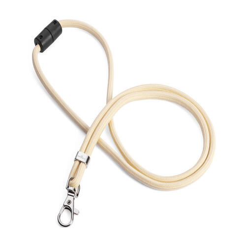 CORDON TEXTILE RECYCLÉ - BEIGE Cordon en textile fabriqué en PET recyclé Avec fermeture de sécurité, s'ouvre en cas de traction excessive Forme ronde et tressée avec mousqueton Idéal pour les porte-badges ou les porte-cartes avec perforation ou pour les clés Longueur du cordon : 46 cm Boîte de 10 pièces