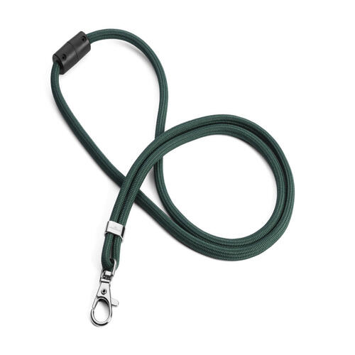 CORDON TEXTILE RECYCLÉ - VERT Cordon en textile fabriqué en PET recyclé Avec fermeture de sécurité, s'ouvre en cas de traction excessive Forme ronde et tressée avec mousqueton Idéal pour les porte-badges ou les porte-cartes avec perforation ou pour les clés Longueur du cordon : 46 cm Boîte de 10 pièces