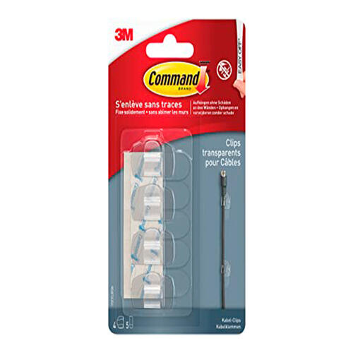 Clip transparent pour câble. S'enlève sans laisser de trace. Se fixe solidement et s'enlève sans abîmer les murs. Coloris transparent. Lot de 4 clips et 5 languettes.