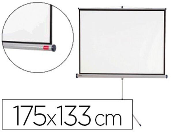 ÉCRANS DE PROJECTION SUR TRÉPIED. Bordure noire pour un meilleur contraste. Format 16/10. Potence d'inclinaison pour une projection sans déformation. Écran facilement repliable dans son carter pour une meilleure protection. 175 x 133 cm', 10,08 kg.