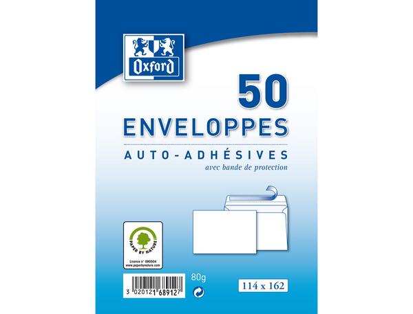Enveloppes Velin, C6, blanc, sans fenêtre patte auto-adhésive avec bande de protection 114 x 162 mm, 80 g petit paquet de 50