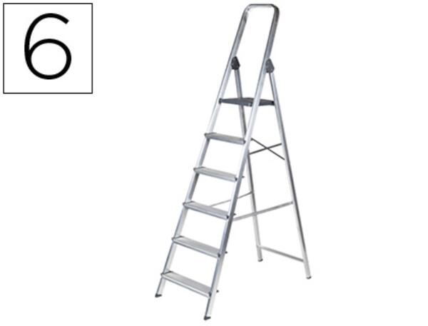 ESCABEAU EN ALUMINIUM 6 marches. Fabriqué avec des matériaux de haute fiabilité. 6 marches. Produit testé et certifié EN131 et GS. Poids maximum supporté : 150 kg. Dimensions : 48 x 99 x 193 cm. Poids : 4,20 kg.