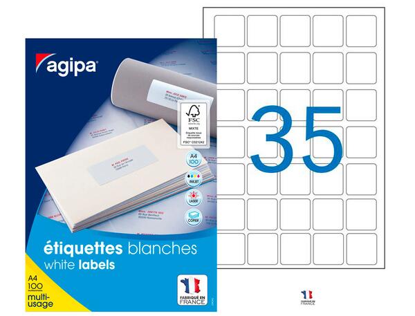 Etiquettes blanches multi-usage, coins arrondis dimension 35,0 x 35,0 mm avec un adhésif permanent. Paquet de 100 feuilles format A4 (3 500 étiquettes). Fabriquées en France avec un papier certifié FSC, les étiquettes Apli Agipa sont compatibles avec imprimantes laser, jet d'encre ou copieurs et garantie anti-bourrage grâce à un adhésif résistant aux hautes températures.