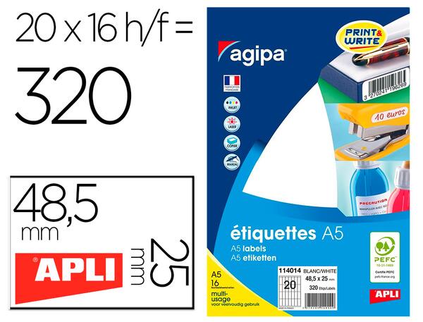 Etiquettes blanches multi usage 48,5x25 mm. Pochette 16 feuilles A5 multi-usage soit 320 étiquettes. Adhésif permanent. Pour plusieurs utilisations : identifier, marquer le prix, signaler, etc. Ces étiquettes sont un produit idéal pour pouvoir imprimer facilement mais aussi pour l'écriture manuelle. Etiquettes adhésives APLI-Agipa compatibles avec les différentes imprimantes jet d'encre, laser et copieurs du marché : Epson, Canon, HP, Lexmark..... Aucun risque de bourrage grâce à l'adhésif résistant aux hautes températures.
