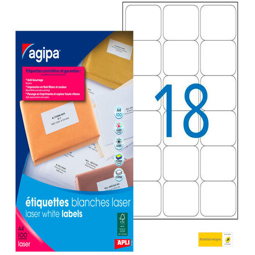 Étiquettes blanches spécialement conçues pour les imprimantes laser. Résistent aux hautes températures et à une grande vitesse d'impression. Papier au séchage rapide de l'encre. Technologie anti-bourrage. Logiciel gratuit « Apli Agipa Soft » d'aide à l'impression téléchargeable sur www.apli.fr. Planches au format A4. Boîte de 100 feuilles.