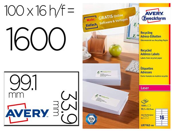Étiquettes blanches 100% recyclées, fabriquées sans chlore. Compatibles avec les imprimantes laser. Garanties sans bourrage. Faciles à décoller de la planche grâce à la bande micro-perforée. Boîte de 100 feuilles. Produit certifié FSC.