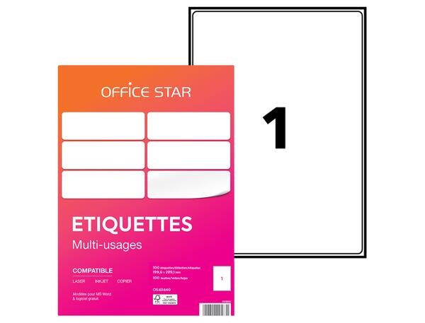 100 étiquettes OFFICE STAR blanches 199,6 x 289,1 mm, impression Laser, Jet d'encre, Copieur