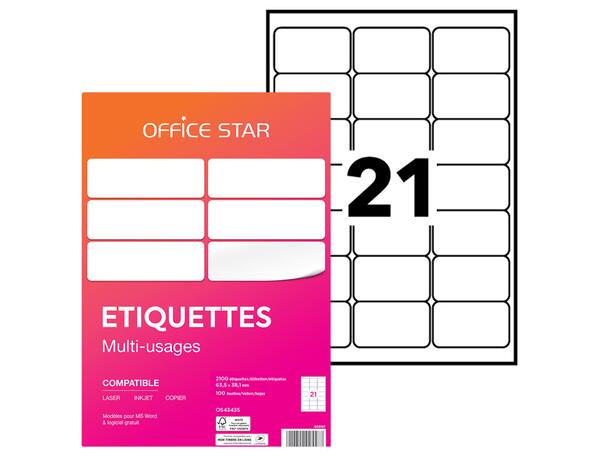 2100 étiquettes OFFICE STAR blanches 63,5 x 38,1 mm, impression Laser, Jet d'encre, Copieur