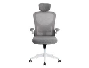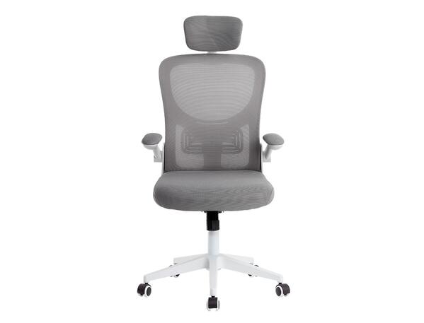 Fauteuil ergonomique avec appuie tête. Assise en mousse et dossier en maille. Réglage en hauteur de l'assise par piston à gaz. Dossier inclinable et blocable. Appui-tête réglable. Renfort lombaire. Accoudoirs fixes en nylon chromé recouverts de manchettes en tissu. Base en nylon blanche. 5 roues en nylon Ø 6 cm. Recommandé pour une utilisation journalière de 8h. Dimensions totales : largeur 630 mm x profondeur 680 mm x hauteur 1170 à 1300 mm. Dimensions utiles : profondeur siège 490 mm x largeur 510 mm x hauteur dossier 690 mm. Poids maximum : 110 kg. Poids du siège : 11 kg.