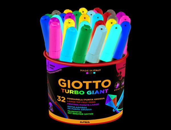Ce set de 32 feutres de coloriage Giotto Turbo Giant est idéal pour stimuler la créativité des enfants et des amateurs d'art. Dotés d'une pointe ogive large de 7,5 mm, ces feutres permettent de colorier facilement de grandes surfaces avec des couleurs vives à base d'eau. Leur encre ultra lavable s'élimine aisément de la peau grâce à de l'eau chaude et du savon, offrant une expérience agréable et sécurisée.