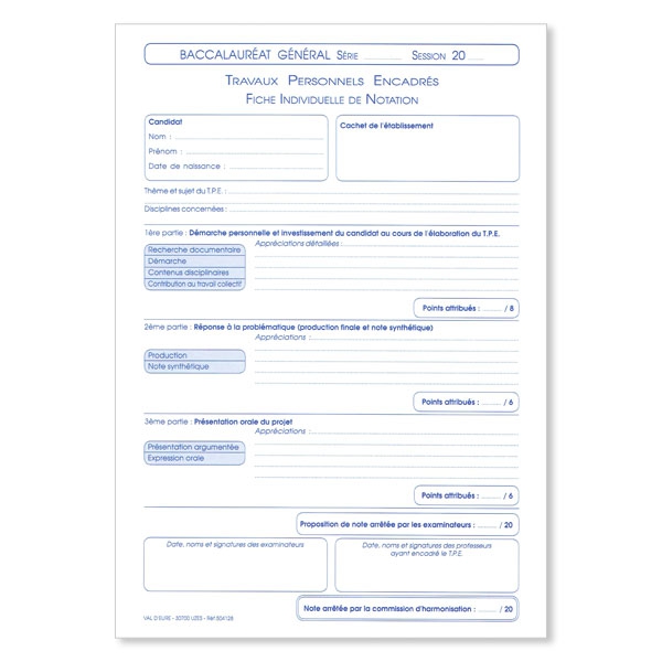 Liasse de 2 feuillets autocopiants destinée à la notation des Travaux Personnels Encadrés (TPE).