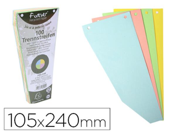 En carte recyclée de 180 g/m². Intercalaires trapézoïdales unis perforés. Dimensions : 105 x 240 mm. 4 coloris assortis. Lot de 100 fiches. Produit certifié Ange Bleu.