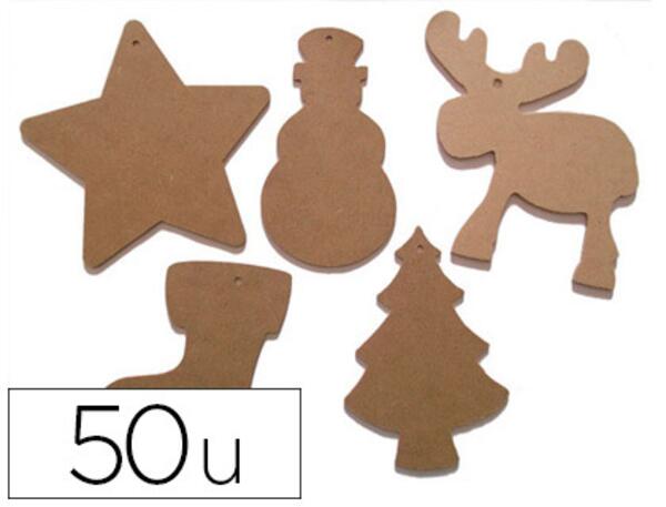 Pièces à suspendre et à décorer et 5 formes différentes (10 de chaque forme) en médium bois (MDF). Hauteur : 140 mm. Sachet de 50 pièces assorties.