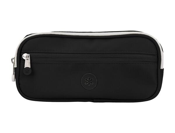Fourre-tout rectangulaire en polyester résistant. 2 compartiments et une poche latérale avec fermetures éclairs dont une de couleur contrastée. Dimensions : 10 x 6 x 21 cm. Coloris noir.