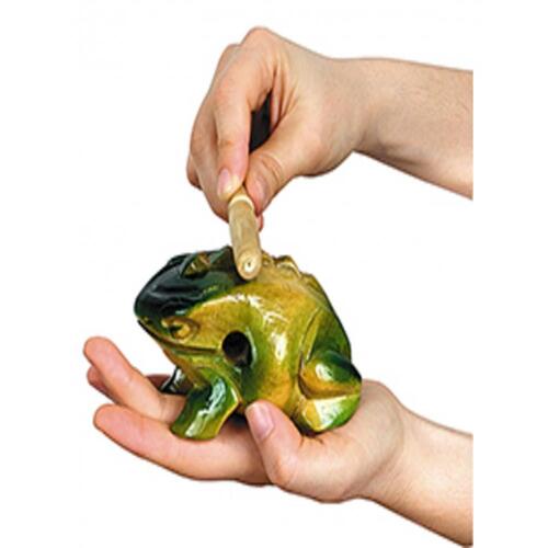 La grenouille guiro est un instrument vietnamien en bois très sonore qui permet d'imiter le coassement de la grenouille. Une prise en main facile pour un effet surprenant ! Le résultat sonore est unique : frottez son dos avec la batte et écoutez... Dim. (L) : 10 cm - L'unité