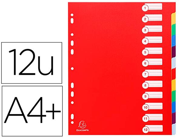 Épaisseur 12/100ème. Souples et indéchirables. Perforation 11 trous. Coloris assortis. Format: 245 x 297 mm (A4+).