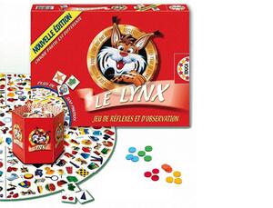 JEU DE SOCIÉTÉ LE LYNX. Contenu : 1 plateau circulaire composé de 9 pièces, 400 cartes d'images et 18 jetons de 6 couleurs. De 1 à 6 joueurs. Permet à l'enfant de développer ses notions d'observation, d'association, de rapidité et de mémorisation. Le joueur le plus rapide à repérer les images sur le plateau gagne la partie.