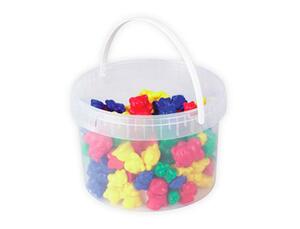 Seau de rangement à anse ontenant 96 oursons en 3 tailles et 4 couleurs : 24 papas ours (dont le poids est 12 g) + 24 mamans ours (dont le poids est 8 g) + 48 bébés ours (dont le poids est 4 g). Le poids du papa est égal au poids de la maman + le poids du bébé. Permet à l'enfant d'apprendre à trier par taille, couleur ou poids. Seau de 96 oursons.