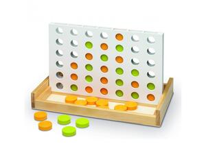 4 en ligne en bois. Principe du jeu : aligner verticalement ou horizontalement ou en diagonale 4 fiches de même couleur. Ce jeu stratégique permet de développer la réflexion et l'anticipation. Contenu : 42 pions en bois (24 rouges + 24 bleus).
