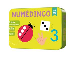But du jeu : 7 petits jeux pour travailler les nombres de 1 à 6 : les cartes les illustrent de 12 façons différentes (collections, dés, doigts de la main...). Les jeux sont organisés en 2 niveaux, PS et MS, et permettent de travailler la numération : l'égalité des quantités représentées de différentes façons, les suites de nombres, les additions de 2 nombres, les comparaisons entre nombres. Contenu : 72 cartes et 1 livret de règles 1 à 8 joueurs - Durée : 15 min