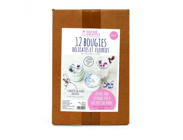 Kit pour 12 élèves. 3 variétés de fleurs. Cire végétale 100% soja. Contenu : 1,2 kg cire de remplissage, 4 mètres de mèche armée, 4 sachets bain marie, 12g bouton rose séchées, 12g fleurs de bruyère séchées et 4g pétale bleuetPour 12 élèves
