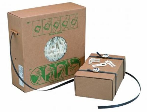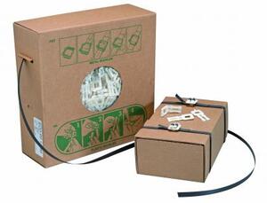 Trousse de cerclage en polypropylène de 12 mm noir. Feuillard de 750 m + 250 boucles plastiques.