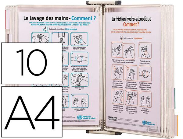 Comprend 1 élément mural, 4 butées latérales pour le maintien optimal des pochettes, 10 pochettes à pivots en PVC Sterifold antibactériennes blanches et 5 cavaliers pour l'indexage des pochettes. Extensible à l'infini par simple juxtaposition. Idéal pour l'affichage des normes d'hygiène (dans les hôpitaux, les laboratoires, les restaurants, les cuisines, etc.). Pour format A4. Coloris blanc.