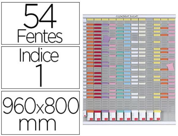 KIT PLANNING GRANDE CAPACITÉ. Support en aluminium avec bandes titres vierges. Comprend 12 bandes planning, 54 fentes indice 2 et 1 bande planning. 1000 fiches T indice 2 (coloris assortis) et 100 fiches T indice 1 (blanches). Dimensions : 96 x 80 cm.