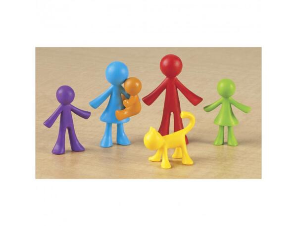 Figurines en 6 coloris différents représentant les personnages de la famille (papa, maman, bébé, frère, soeur) et un animal de compagnie. Permet de travailler des notions d'identité et de mathématiques (tri par taille, par couleur, reproduction de modèles..). Le lot de 72 pièces - Dim. du plus grand personnage (H) : env. 5 cm
