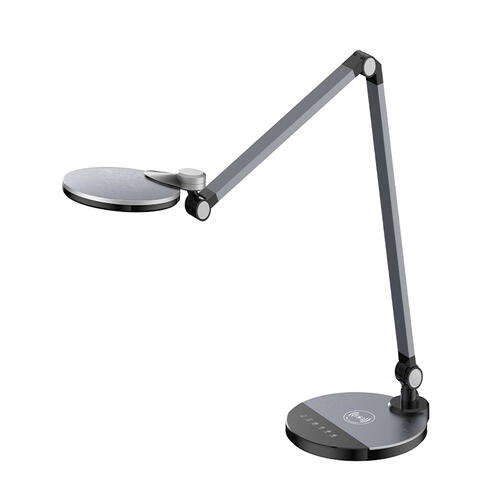 Lampe de bureau en ABS et aluminium. Interrupteur tactile. Réglage de la température, 3 niveaux de couleur (CCT : 3 000 K-6 300 K), fonction veilleuse. Bras et tête inclinables pour un éclairage optimal. Fonction de recharge sans fil pour les téléphones portables compatibles avec voyant. Lampe de 120 LED, 1000 lux. Lumen : 600Lm. Puissance 9 W. Jusqu'à 20 000 heures d'éclairage. Classe énergétique E. Coloris noir. Dimensions : 192 x 150 x 905 mm.