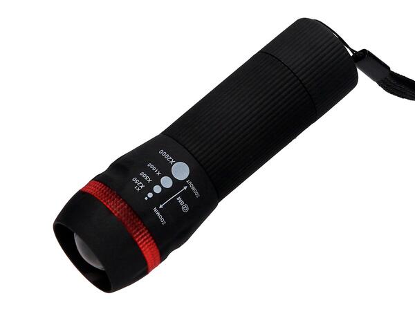 En plastique. Avec zoom de 1 watt. Mode d'éclairage : ON/OFF. 3 piles AAA incluses. Coloris noir et rouge. Dimensions : 106 x 33 mm.