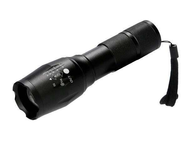En aluminium. 300 Lumen. Modes d'éclairage : fort, moyen, bas, stroboscopique, SOS. Bouton OFF. Alimentation à 3 piles AAA incluses. Coloris noir. Dimensions : 137 x 40 mm.