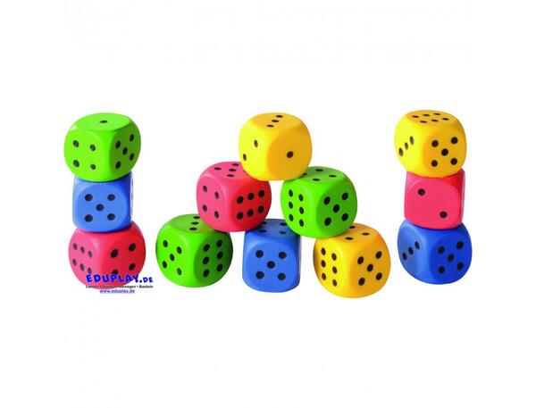 De grands dés silencieux pour jouer en intérieur comme en extérieur. Arête : 4 cm. Contenu : 12 dés - Coloris assortis : bleu, rouge, jaune et vert