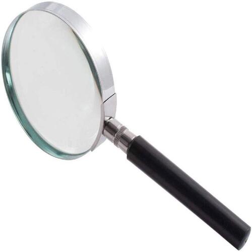 Anneau en métal, lentille en verre, poignée en plastique noir. Verre optique anti-déformation. Grossissement x3.