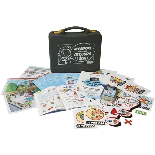 Mallette conforme au programme basé sur les compétences à acquérir de "Apprendre à porter secours" du Ministère de l'Education Nationale, l'Enseignement supérieur et de la recherche, Direction Générale de l'Enseignement scolaire, Ministère de la Santé et des Solidarités, Direction Générale de la Santé.
