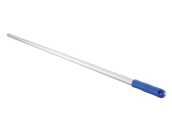 Manche en aluminium anodisé. 3 perçages à 5, 17 et 22 mm du bord. Coloris gris et poignée bleue. Diamètre : 2,3 cm. Longueur : 1,40 m.