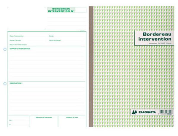 Optimisez la gestion de vos interventions avec notre manifold autocopiant Exacompta, conçu spécialement pour les bordereaux d'intervention. Que vous soyez un auto-entrepreneur ou une entreprise, ce document certifié FSC vous permet de justifier facilement vos devis et factures, tout en évitant l'application de la TVA à vos clients. Profitez de sa conception intelligente pour garder une trace claire et ordonnée de chaque intervention.