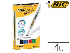 La boîte contient 4 unités de marqueurs BIC Velleda 1711. Les couleurs incluses dans la boîte sont généralement variées, permettant un usage polyvalent en fonction des besoins, par exemple, noir, bleu, rouge, et vert.