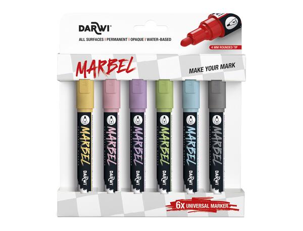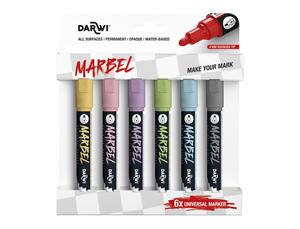 Le set de 6 marqueurs Darwi Marbel Universel avec pointe ronde medium de 4 mm propose une solution polyvalente et de qualité pour tous les projets créatifs. Adapté aux enfants comme aux adultes, ce lot de couleurs pastel offre une encre acrylique à base d'eau, opaque et permanente, qui adhère sur de multiples surfaces avec une finition mate agréable.