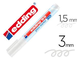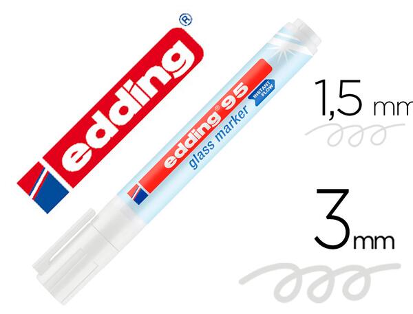 Le marqueur Edding 95 est spécialement conçu pour écrire sur des surfaces en verre, mais peut également être utilisé sur d'autres surfaces lisses comme le métal ou le plastique. La particularité de ce marqueur est sa pointe ronde, qui permet de tracer des lignes d'une épaisseur variant de 1,5 à 3 mm. Le coloris blanc le rend particulièrement utile pour les surfaces sombres ou transparentes où une encre classique ne serait pas bien visible.