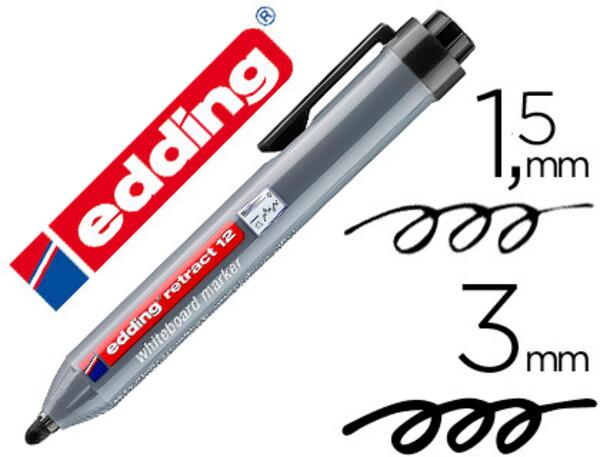 MARQUEUR TABLEAUX BLANCS RÉTRACTABLE E12. Avec bouton-poussoir mécanique pour faire sortir la pointe et la rétracter. Sans capuchon. Le système cap-off empêche le marqueur de sécher lorsque la pointe est rétractée. Pointe ogive. Tracé de 1,5 à 3 mm. Noir.