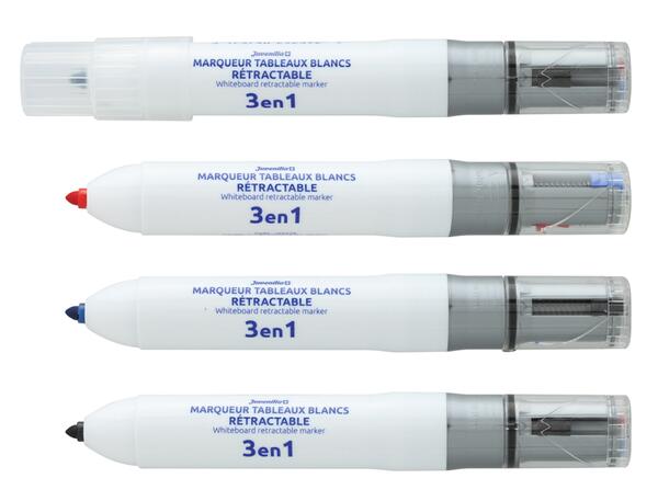 Marqueur tableau blanc multicolore JUVENILIA 3 en 1 rechargeable Pointes fines coniques : 1~2 mm rétractables 3 couleurs vives : rouge, bleu, noir 3 marqueurs dans un stylo ' changement rapide de couleurs Grande qualité d'effaçage Capuchon amovible Marqueur rechargeable 3 x moins de plastique : 3 marqueurs en 1 Ouvert 12h sans sécher