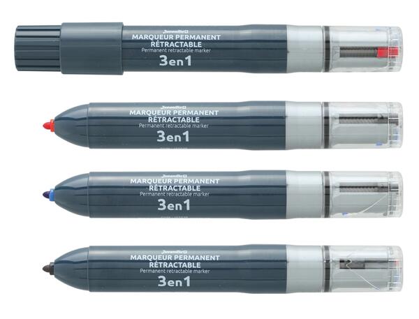 Marqueur permanent multicolore JUVENILIA 3 en 1 - rechargeable 3 coloris : rouge + bleu + noir 3 marqueurs dans un stylo ' changement rapide de couleurs Pointes fines coniques 1~2 mm rétractables Pour le papier, plastic, métal + autres surfaces Séchage rapide Résiste à l'eau et à la lumière Capuchon amovible 3 x moins de plastique : 3 marqueurs en 1 Ouvert 4h sans sécher