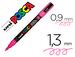 Peinture opaque et couvrante, sans alcool ni solvant. Sans odeur. Encre à base d'eau. Permanente sur les surfaces poreuses et effaçable sur le verre. Couleurs miscibles aquarellables et superposables. Pointe conique fine en polyester. Trait 0,9 à 1,5 mm. Coloris fuchsia.