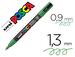 Peinture opaque et couvrante, sans alcool ni solvant. Sans odeur. Encre à base d'eau. Permanente sur les surfaces poreuses et effaçable sur le verre. Couleurs miscibles aquarellables et superposables. Pointe conique fine en polyester. Trait 0,9 à 1,5 mm. Coloris vert foncé.
