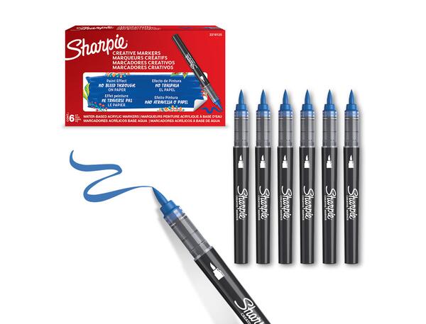 "Sharpie® Brush' Marqueurs Créatifs | Pointe Pinceau | Largueur du trait : minimum 1.2 mm | Marqueur opaque à débit d'encre instantané, sans dégorgement | Surfaces d'application : papier, métal, bois, céramique, verre, roche, toile, y compris sur les surfaces sombres et claires ! | Encre Acrylique | """PARANG""" Bleu | Boîte de 6"