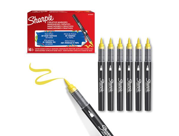 "Sharpie® Brush' Marqueurs Créatifs | Pointe Pinceau | Largueur du trait : minimum 1.2 mm | Marqueur opaque à débit d'encre instantané, sans dégorgement | Surfaces d'application : papier, métal, bois, céramique, verre, roche, toile, y compris sur les surfaces sombres et claires ! | Encre Acrylique | """YELLOW""" Jaune | Boîte de 6"