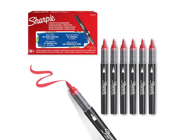"Sharpie® Brush' Marqueurs Créatifs | Pointe Pinceau | Largueur du trait : minimum 1.2 mm | Marqueur opaque à débit d'encre instantané, sans dégorgement | Surfaces d'application : papier, métal, bois, céramique, verre, roche, toile, y compris sur les surfaces sombres et claires ! | Encre Acrylique | """RED""" Rouge | Boîte de 6"