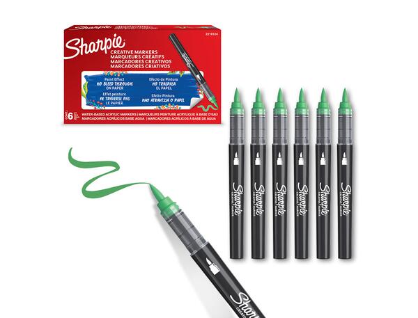 "Sharpie® Brush' Marqueurs Créatifs | Pointe Pinceau | Largueur du trait : minimum 1.2 mm | Marqueur opaque à débit d'encre instantané, sans dégorgement | Surfaces d'application : papier, métal, bois, céramique, verre, roche, toile, y compris sur les surfaces sombres et claires ! | Encre Acrylique | """GREEN""" Vert | Boîte de 6"